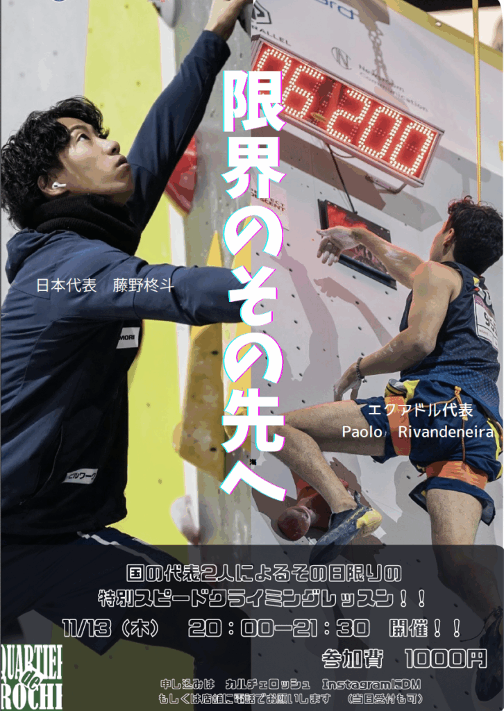 カルチェロッシュのスタッフで現役のスピード日本代表選手でもある藤野柊斗選手による有料レッスンです。パワーアップをテーマとしたレッスンなので、スピードクライミングにとどまらずボルダリングにも有効なレッスン内容になっています。ぜひ一度受けてみてください。参加費1,000円(税込)